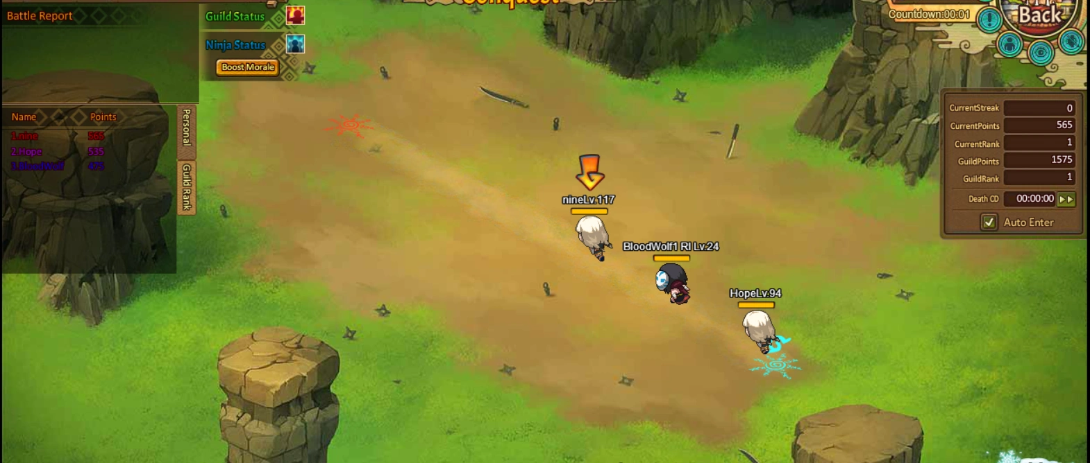 This event is an automatic event, meaning you don't have to do anything. Make sure Auto Enter is checked and you can relax for about 30 minutes. In order to partake in the event you have to register for it which occurs 30 minutes before the actual event, registrations ends 10 minutes before start. The event takes about 30 minutes to complete and involves entering the field in such away as to overcome oncoming foes of opposing guilds, and make it to the other side of the field. To enter the field click the blue beacon. Playing gains guild points. The Boost Morale option increase the power of guild members though inspiration, It increases by 1% in both attack power, and health. The highest ranking guild gets 20 guild chests. Going auto can be fine, but entering manually can in some cases provide better results.